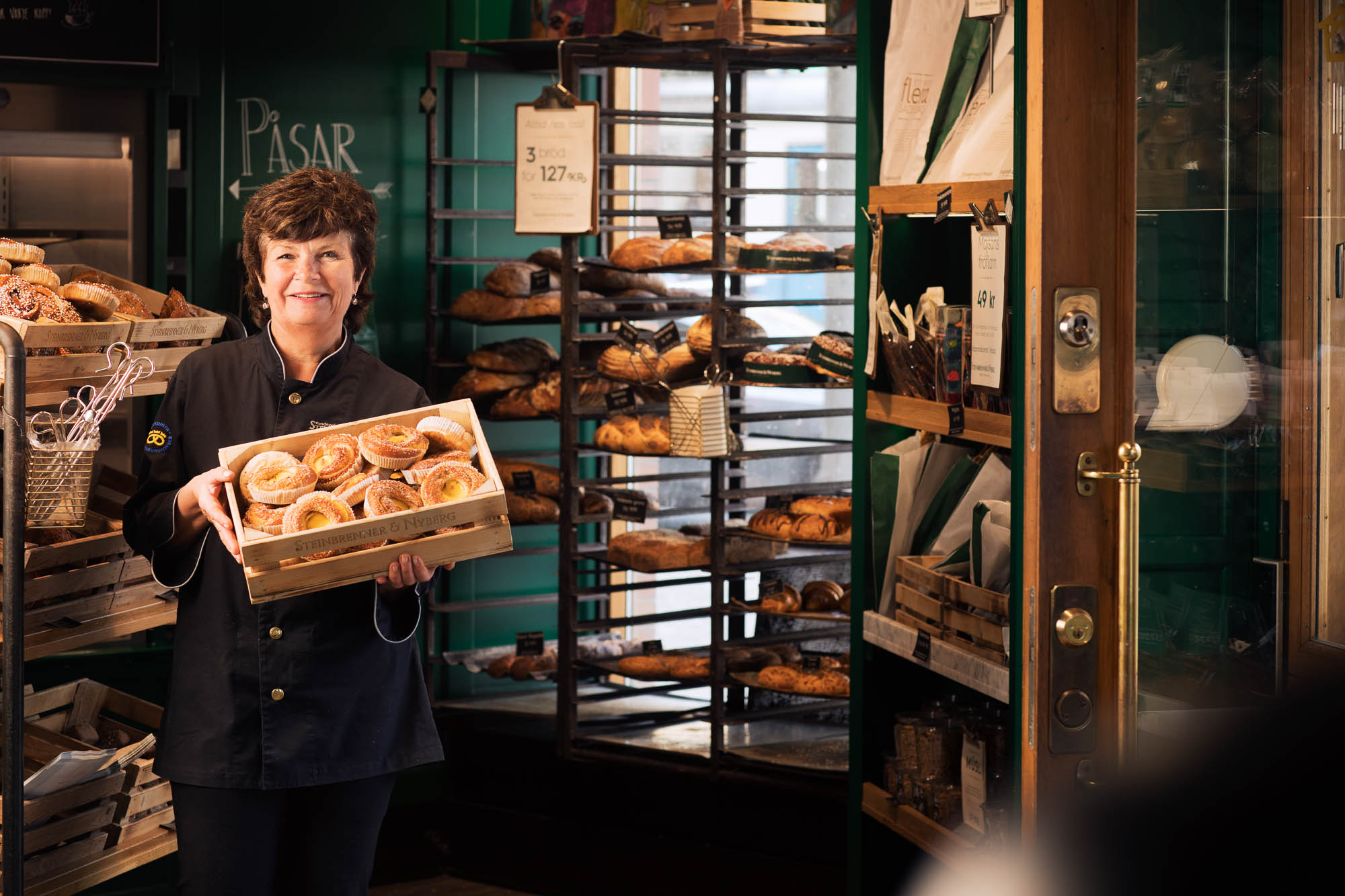 På hörnet Linnégatan/Järntorget finner du Steinbrenner & Nybergs nyrenoverade butik med självplock av färska bröd, frallor, kransar och bullar. Här flyger ostfrallorna över disken redan klockan 7:00 till de som missat frukosten. För att inte tala om tårtor – det finns ju alltid något att fira.